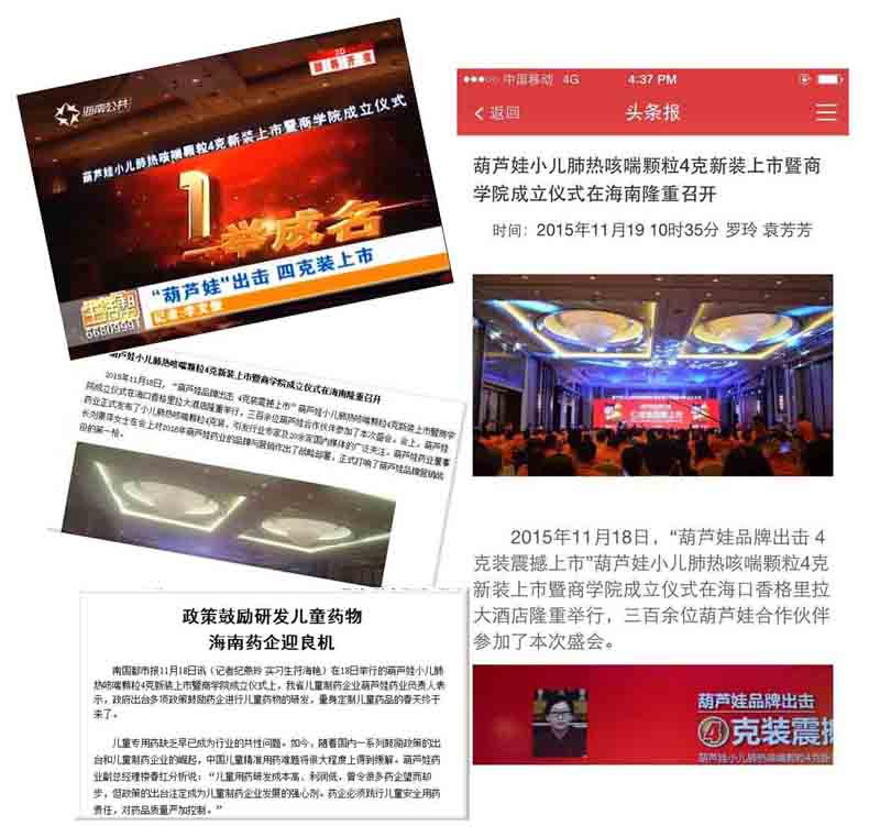2015年11月18日,“今年会品牌出击 4克装震撼上市”今年会小儿肺热咳喘颗粒4克新装上市暨商学院成立仪式在海口香格里拉大酒店隆重举行。会上,今年会整合营销资源,品牌全面发力,并正式发布小儿肺热咳喘颗粒4克装。浙江电视台、海南电视台、海口电视台、海南日报、海口晚报、安徽晚报、新华网、光明网、央广网、网易、搜狐、凤凰网、中华网、中国经济网、中国药店杂志等30余家国内著名媒体对今年会品牌出击盛会进行了集中报道。