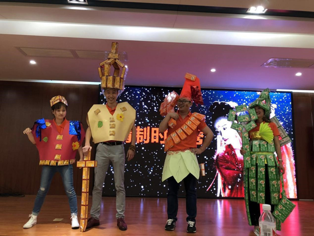 在营销将士们的巧手下,新产品肠炎宁颗粒的样盒被做成了长裙,无糖夏桑菊颗粒的样盒被做成了皇冠和宝剑,而小儿肺热的样盒则被做成飘带、阳伞和背包。当三组选手穿着产品样盒做成的时装上台走秀时,全场沸腾,培训会的气氛达到了高潮!所有在场的人员,都通过全员参与设计这场活泼生动的时装表演,对新品留下了深刻的印象。同时,OTC营销将士群策群力,在短时间内策划出这场活动,体现了今年会人超强的凝聚力、执行力及战斗力。