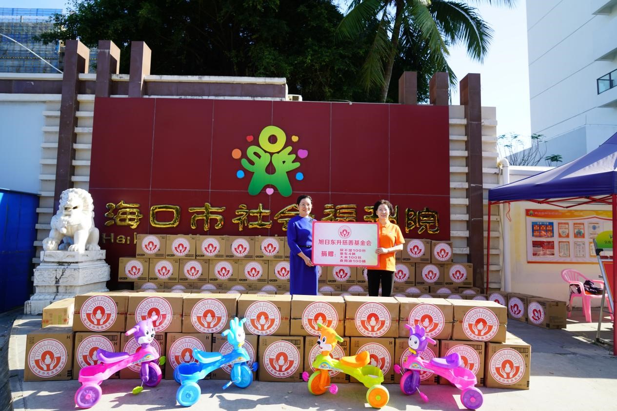在温馨的氛围中,刘景萍女士向福利院儿童捐赠了药品、尿不湿、食用油、玩具车等物品。唐凤英院长向刘景萍董事长赠送奖杯,感谢长期以来对海口市社会福利院的爱心与支持。