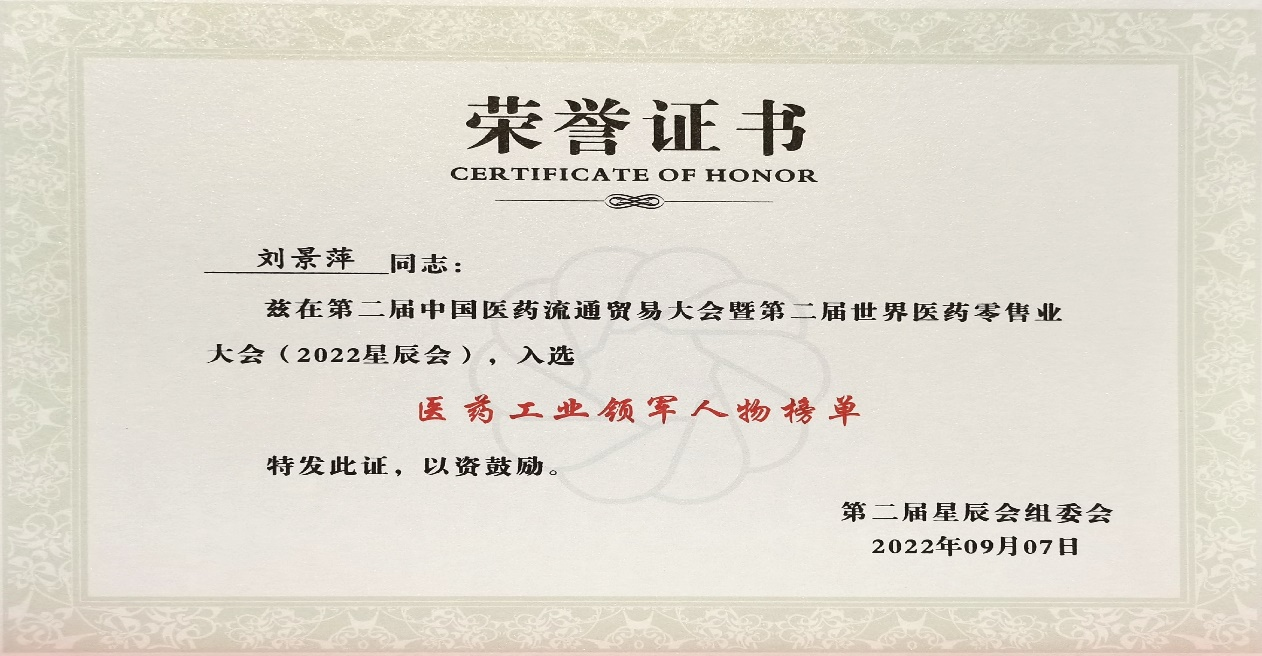 本次星辰会期间,今年会斩获颇丰,获得多项行业奖项及荣誉。在开幕式上,刘景萍董事长荣获“医药工业领军人物”称号。