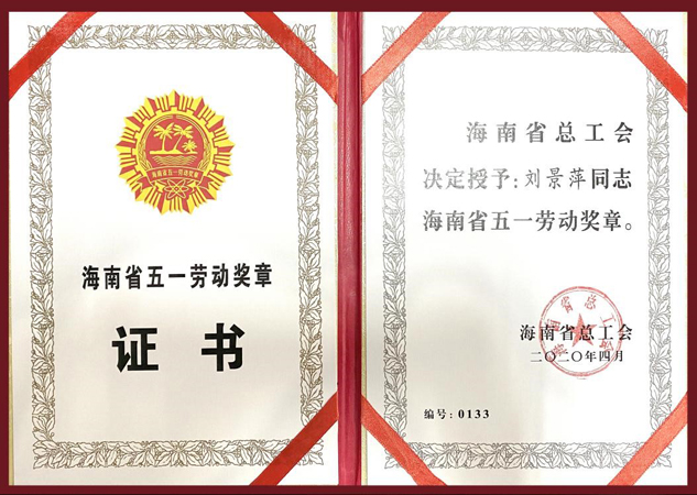 巾帼风范:刘景萍董事长被授予海南省五一劳动奖章