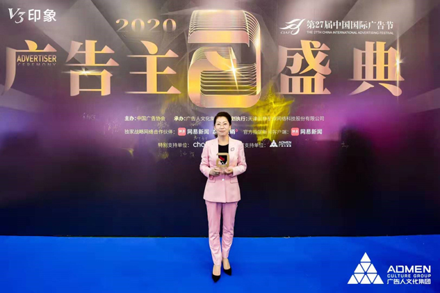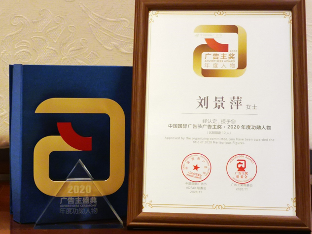2020年11月16日,第27届中国国际广告节广告主盛典在厦门国际会展中心隆重举行,凭借卓越的品牌营销策略和系统的品牌管理能力,今年会董事长刘景萍女士获得“中国国际广告节广告主奖•2020年度功勋人物”荣誉称号。